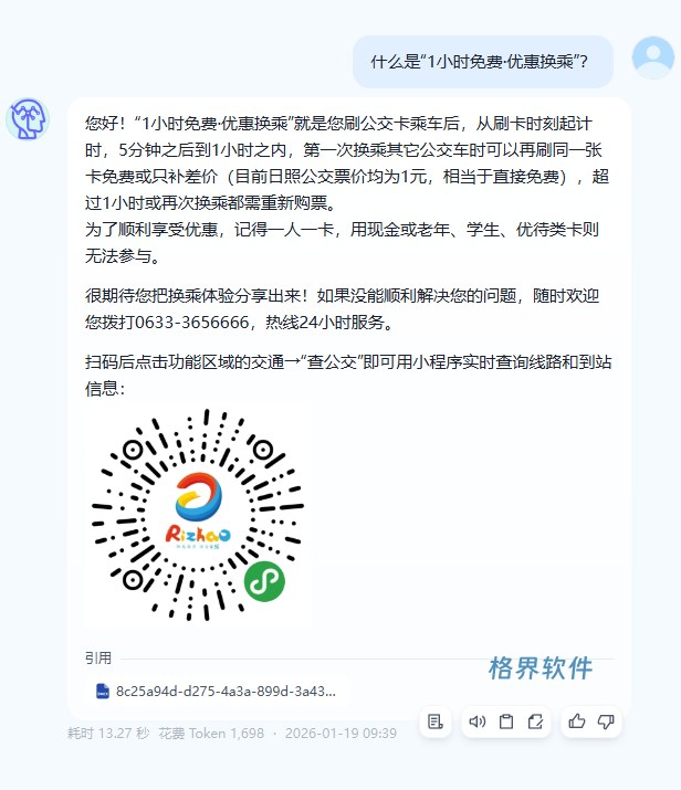 - 行业知识图谱: 内置日照全域公交线网数据、票价政策、IC卡办理规则及实时调度信息。
